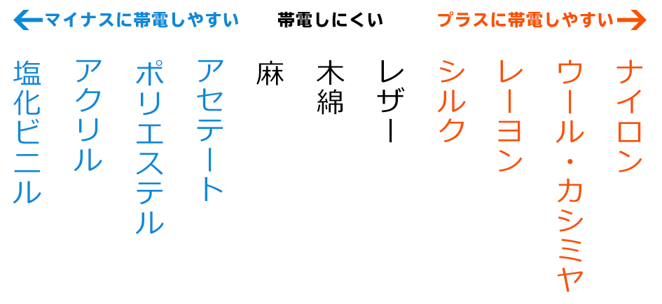 木綿を中心に左右へ行くほど帯電しやすい傾向があり、組み合わせる素材同士の位置が離れているほど静電気は発生しやすくなります。