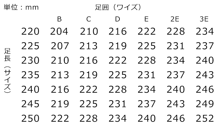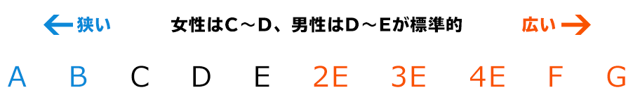 D~3Eくらいが多いでしょうか。アメリカブランドの靴だとN、M、Wといった表記もあります。
